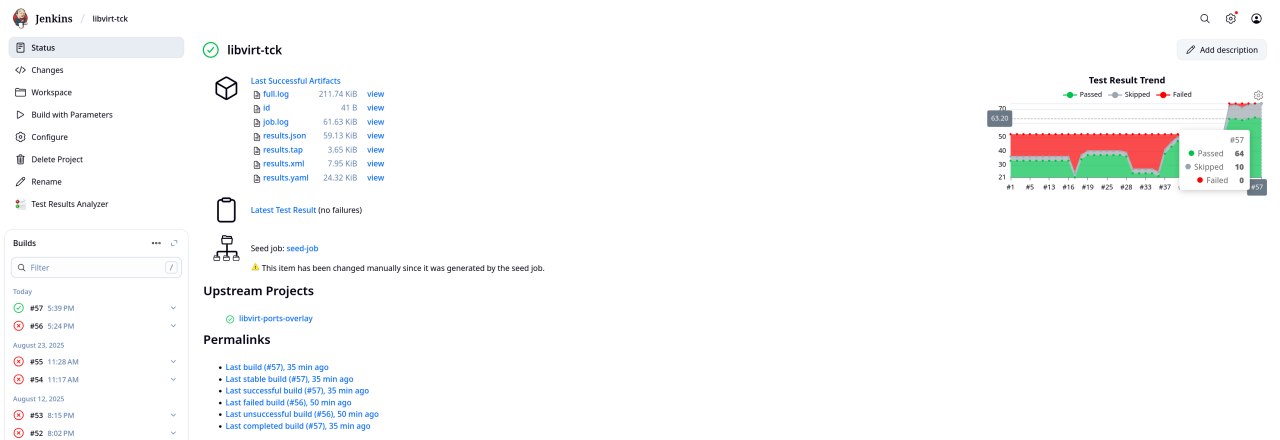 - Spin up a BastilleBSD container, install the libvirt packages from the previous step, check out libvirt-tck from Git, run the tests, and publish the results.